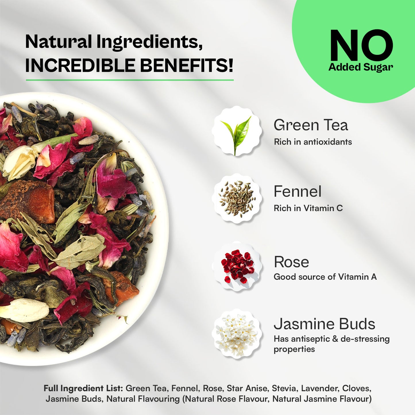 Green Tea, Fennel, Rose, Star Anise, Stevia, Lavender, Cloves, Jasmine Buds, Natural Flavouring (Natural Rose Flavour, Natural Jasmine Flavour)