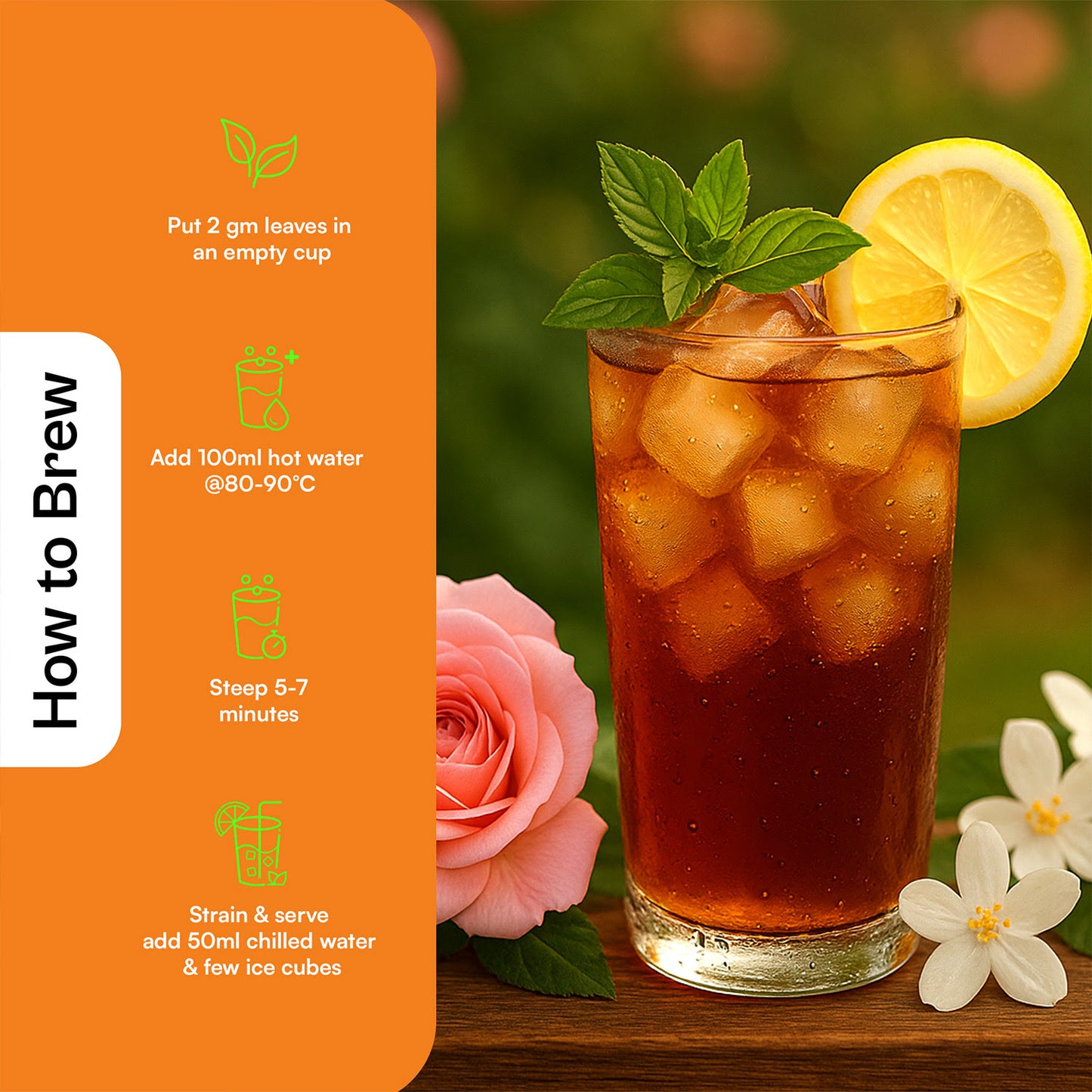 Our tea masters have created a magical duo of Rose and Jasmine to fill your tea session with love and mesmerising fragrance. The ethereal essence of the rose sings a lovely symphony of delight and jasmine joins the chorus weaving a fragrant spell that captivates the senses. Sweetened lightly with stevia, this iced tea embodies a perfect harmony of flavours. The subtle taste of cloves adds a hint of mystery, a warm undertone that gently intrigues and invites you to linger in the moment. As you dive deeper, allow your senses to relish the lusciousness of lavender complemented with star anise and fennel adding a refreshing twist. Beat the summer heat with Rose Jasmine Iced Tea and rejoice in the rejuvenating flavour.